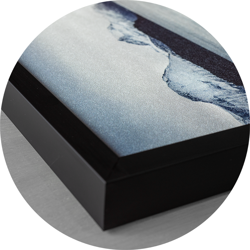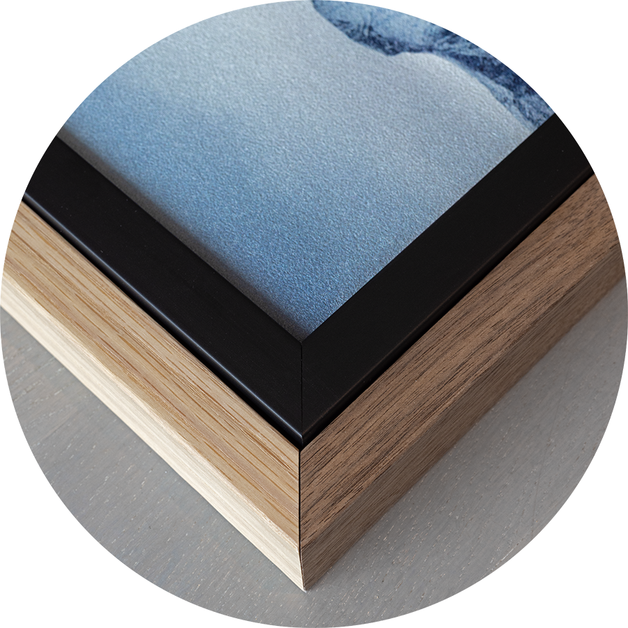 Bildene leveres med stilren ramme i tre ulike utførelser: matt sort, lys eik eller brun eik. Med ramme får bildet en total tykkelse på 3 cm, som gir et solid og eksklusivt uttrykk.